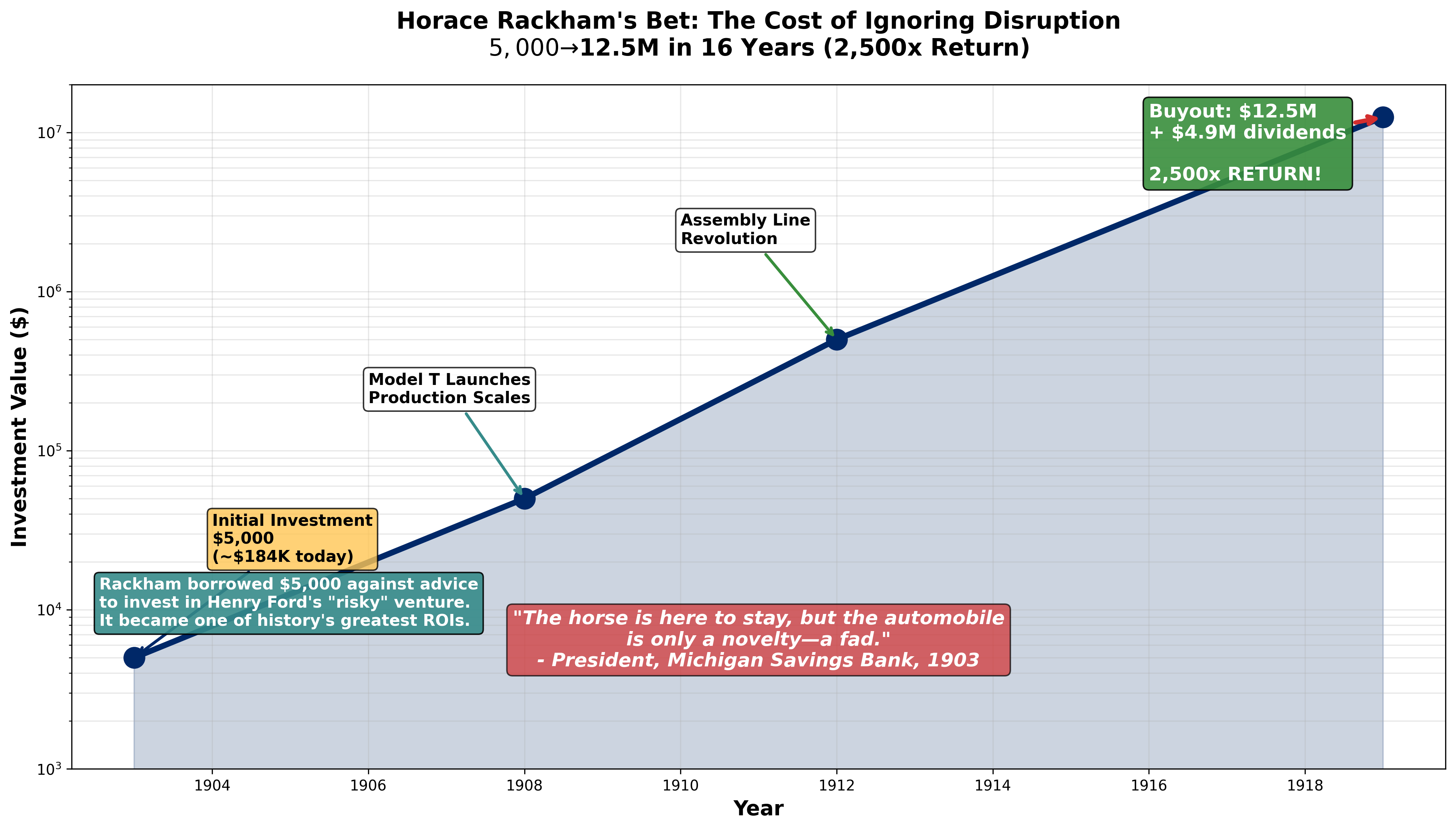 In 1903, a guy named Horace Rackham wanted to invest five thousand dollars in Henry Ford's new automobile company. His banker told him: "Don't do it. The automobile is a fad. The horse is here to stay."