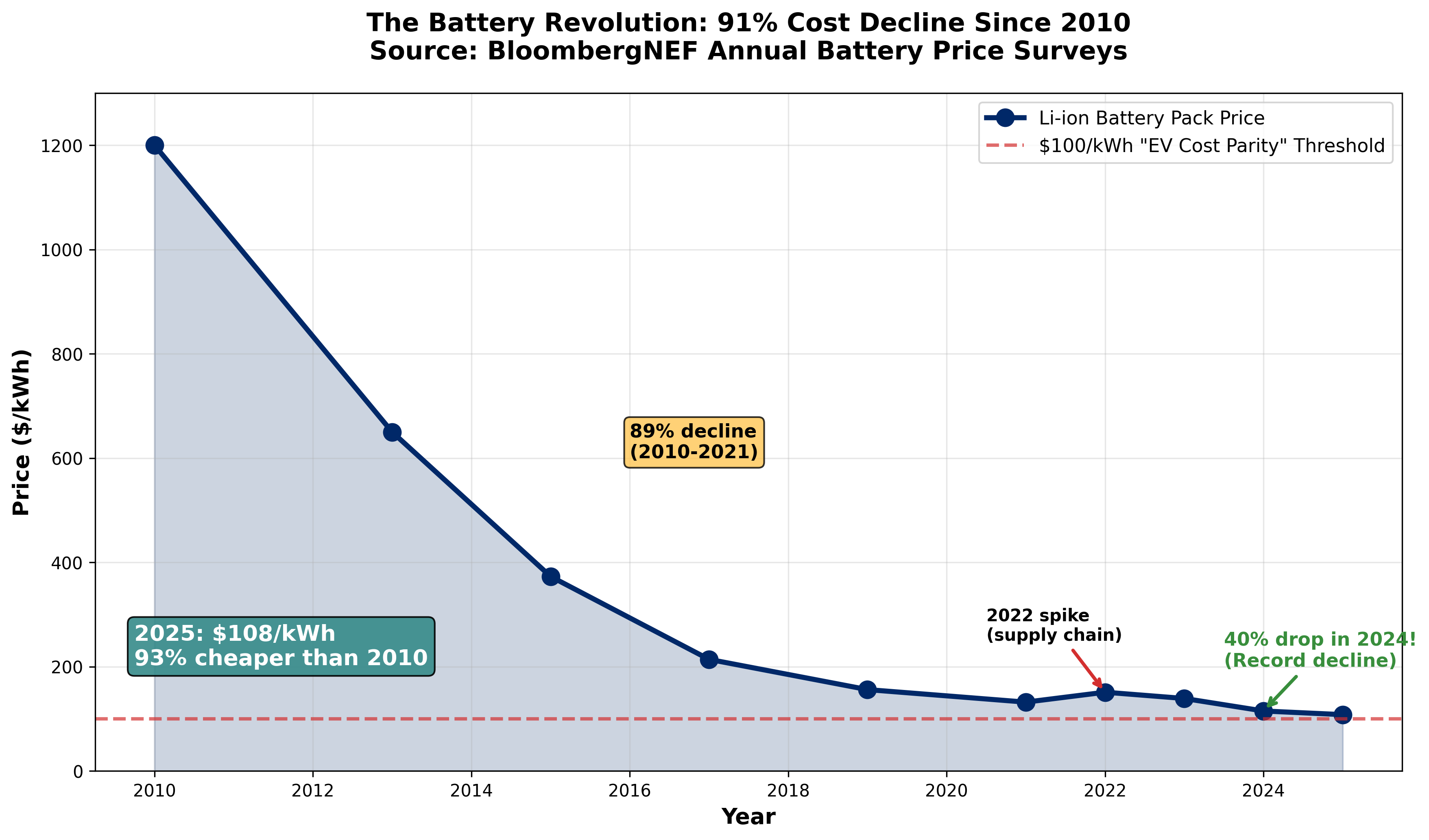 And... okay, that's interesting. There's this Bloomberg tracker showing lithium-ion batteries cost twelve hundred dollars per kilowatt-hour in 2010. By 2025 they're at one hundred and eight dollars.