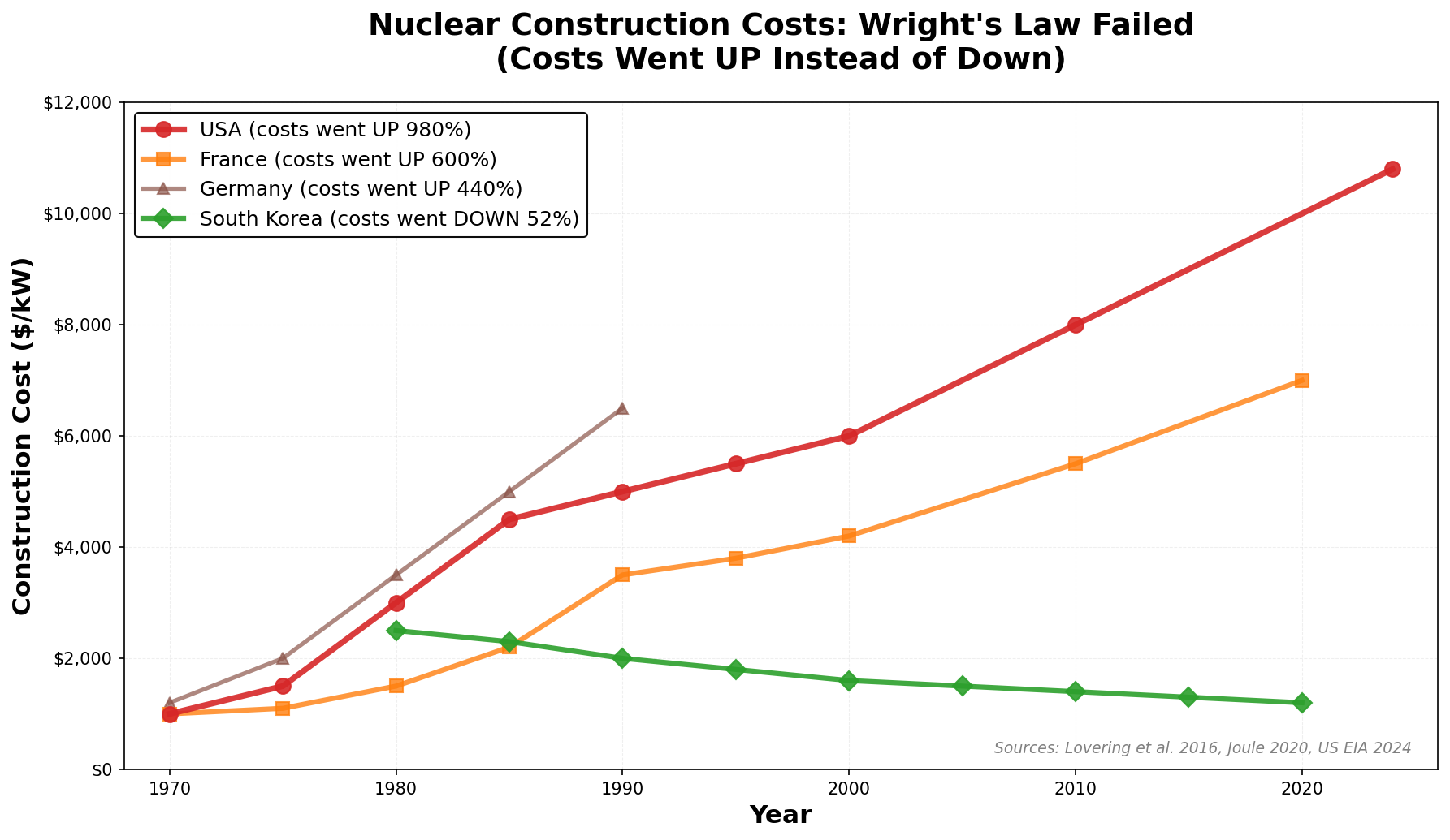 Before 1970, nuclear was crushing it. Costs falling twenty-three to thirty-five percent per doubling. France, USA, everyone seeing economies of scale.