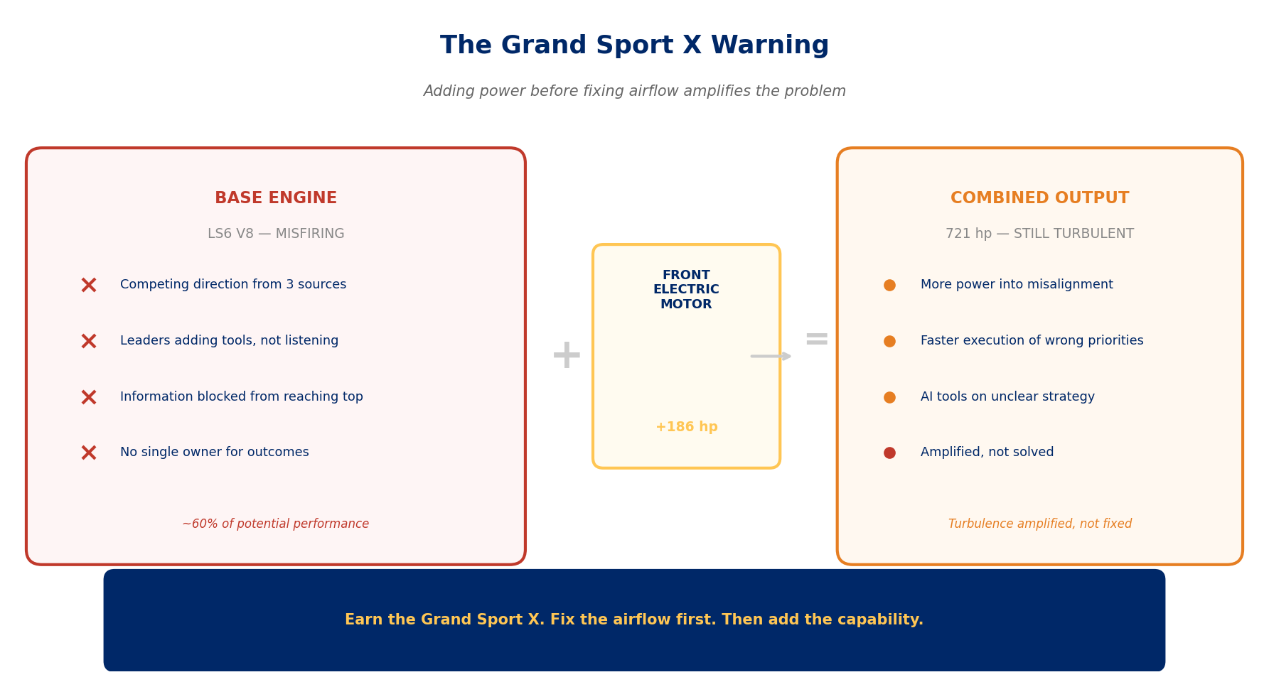 Stop adding power before you fix the airflow. Before the next tool, platform, or initiative, audit what is already in place. What is not flowing? Where is information getting blocked? Where is ownership unclear? Identify the restriction before you increase the fuel.