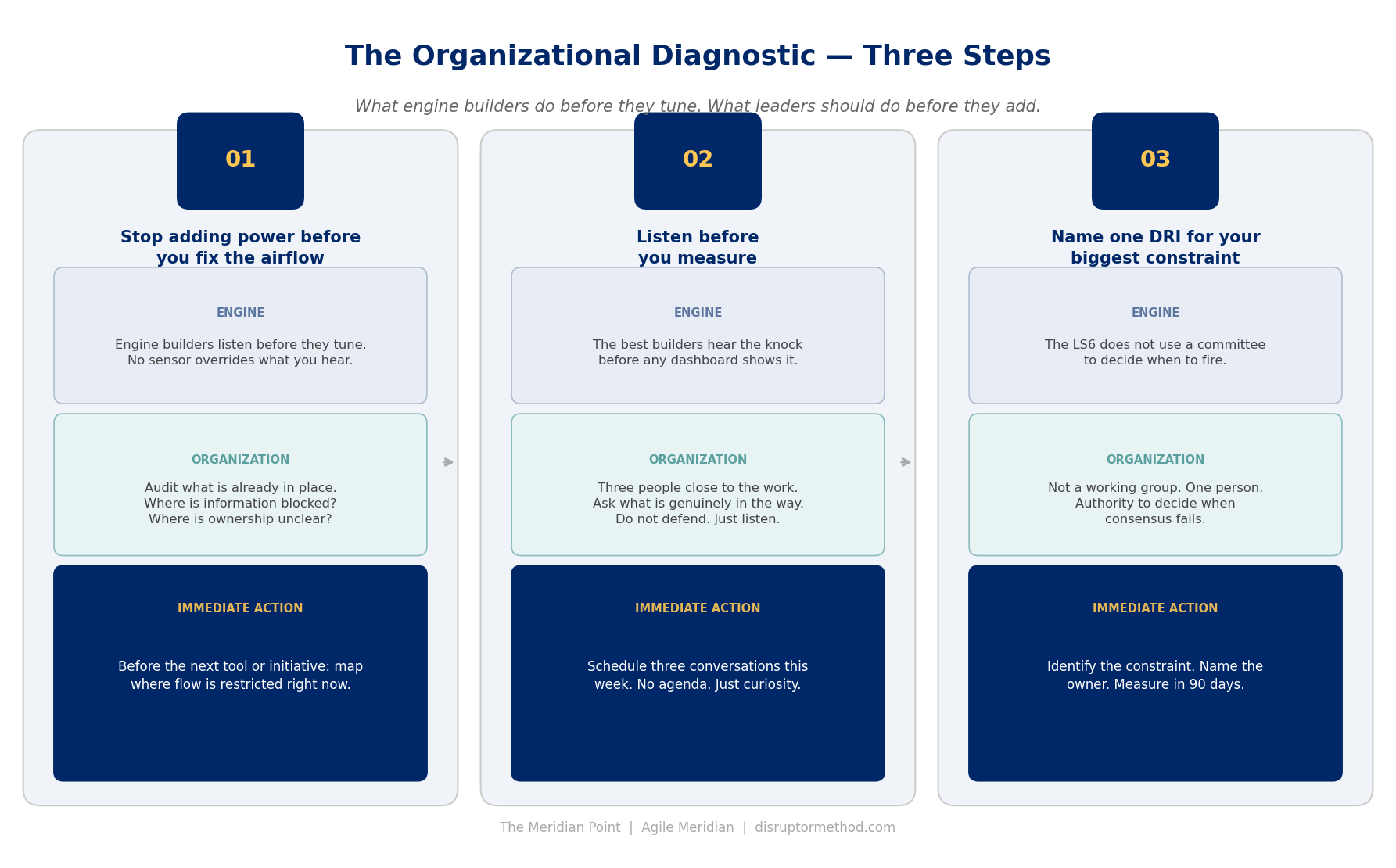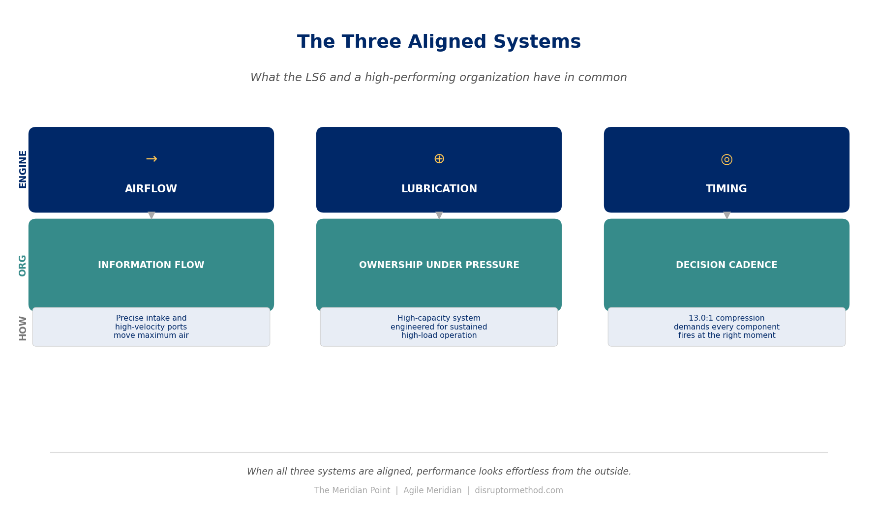 Ownership under pressure. The LS6 does not shed horsepower under sustained load. Its lubrication system is specifically engineered for high-temperature, high-stress operation. Organizations fail at exactly this point: when the pressure increases, ownership collapses. Accountability diffuses. The DRI, the Directly Responsible Individual, is the organizational equivalent of that lubrication system. Not a committee. Not a consensus. One person who owns the outcome and makes the call when consensus cannot be reached. Simple. Not easy. But non-negotiable if you want sustained performance.